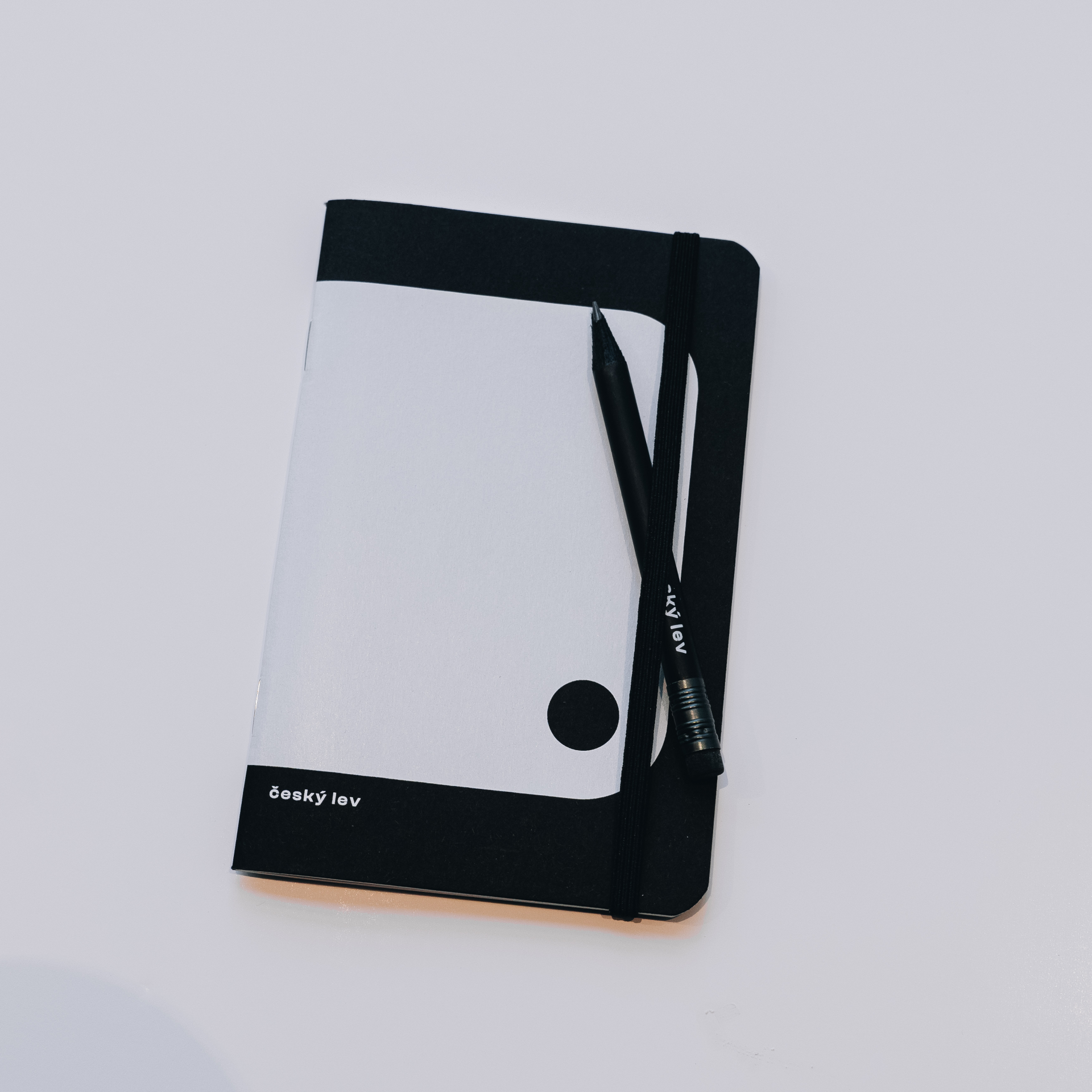 Černý bloček s gumičkou a natur tužkou s nápisem Český lev